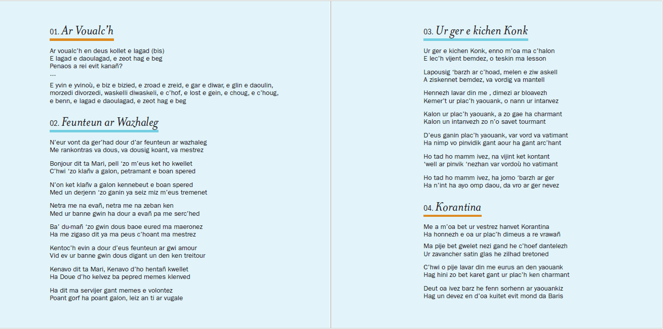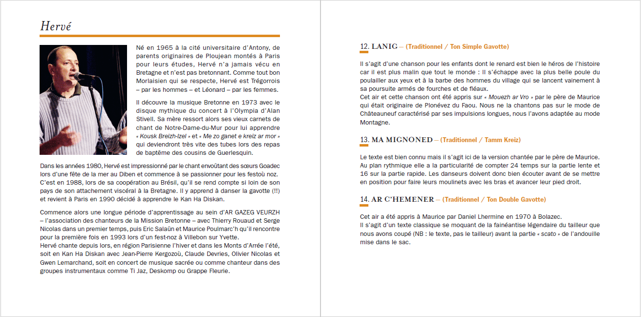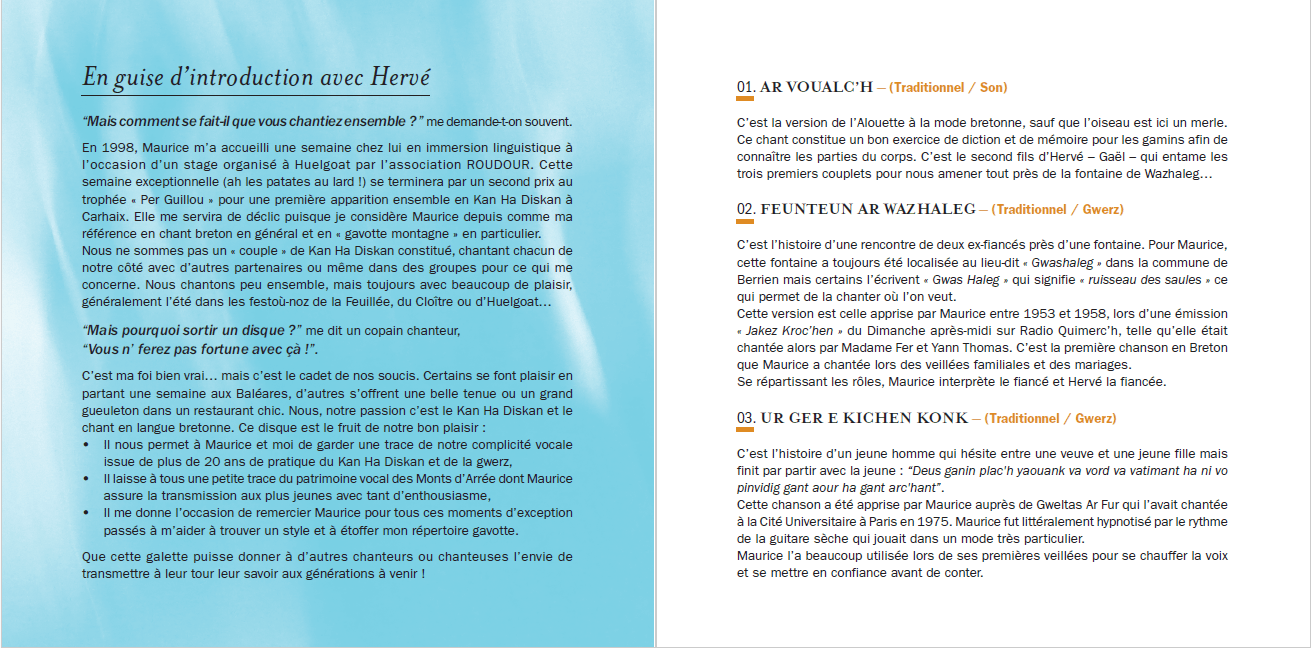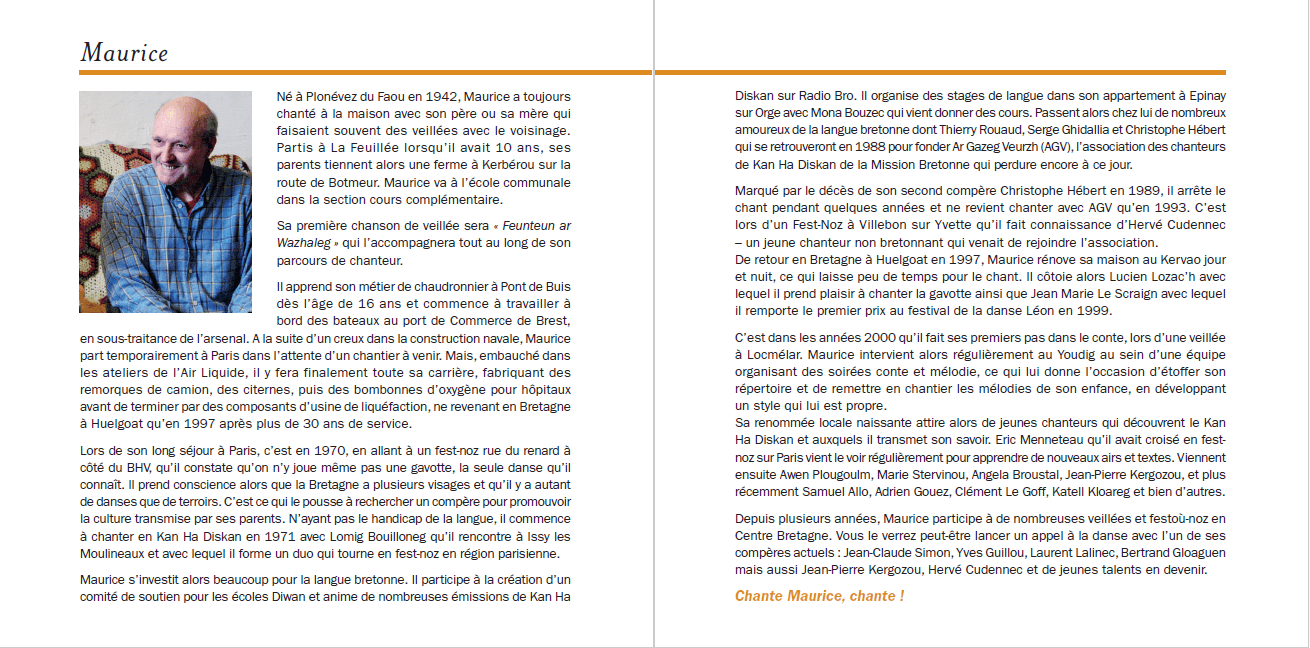 Maurice le dit souvent aux jeunes : "Laisse tomber ta feuille, vis l'histoire de l'intérieur !". Pourtant, pour apprendre, il faut le texte. C'est pourquoi nous avons soigné un livret de 32 pages contenant l'intégralité des paroles en breton. C'est un outil de travail autant qu'un souvenir.